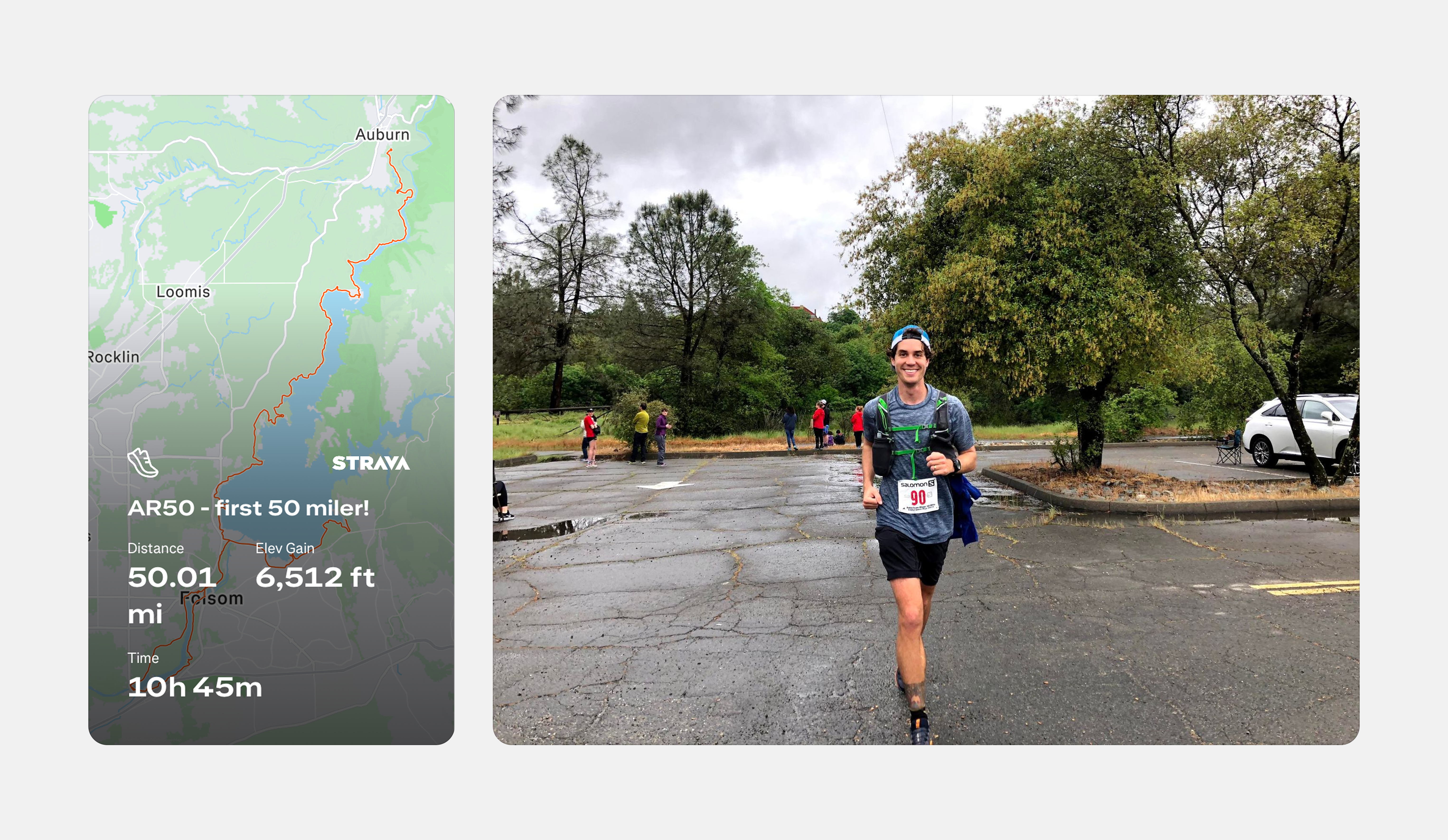 My first 50 mile race. I remember starting the race soaking wet at 4am and the true happiness of finishing and laying on the ground.